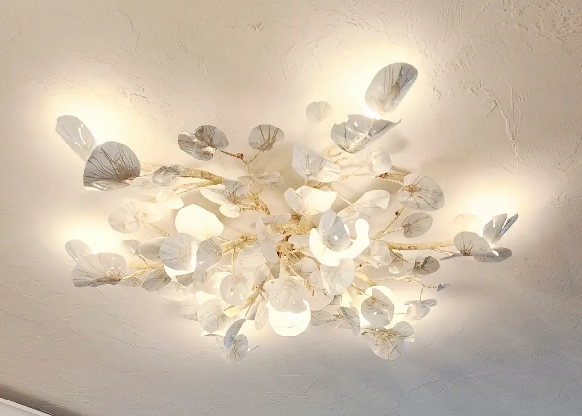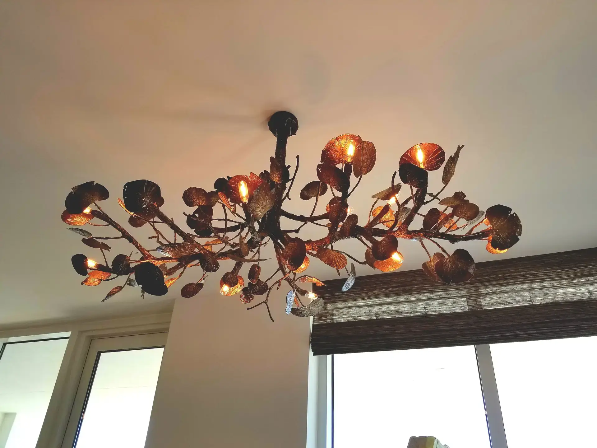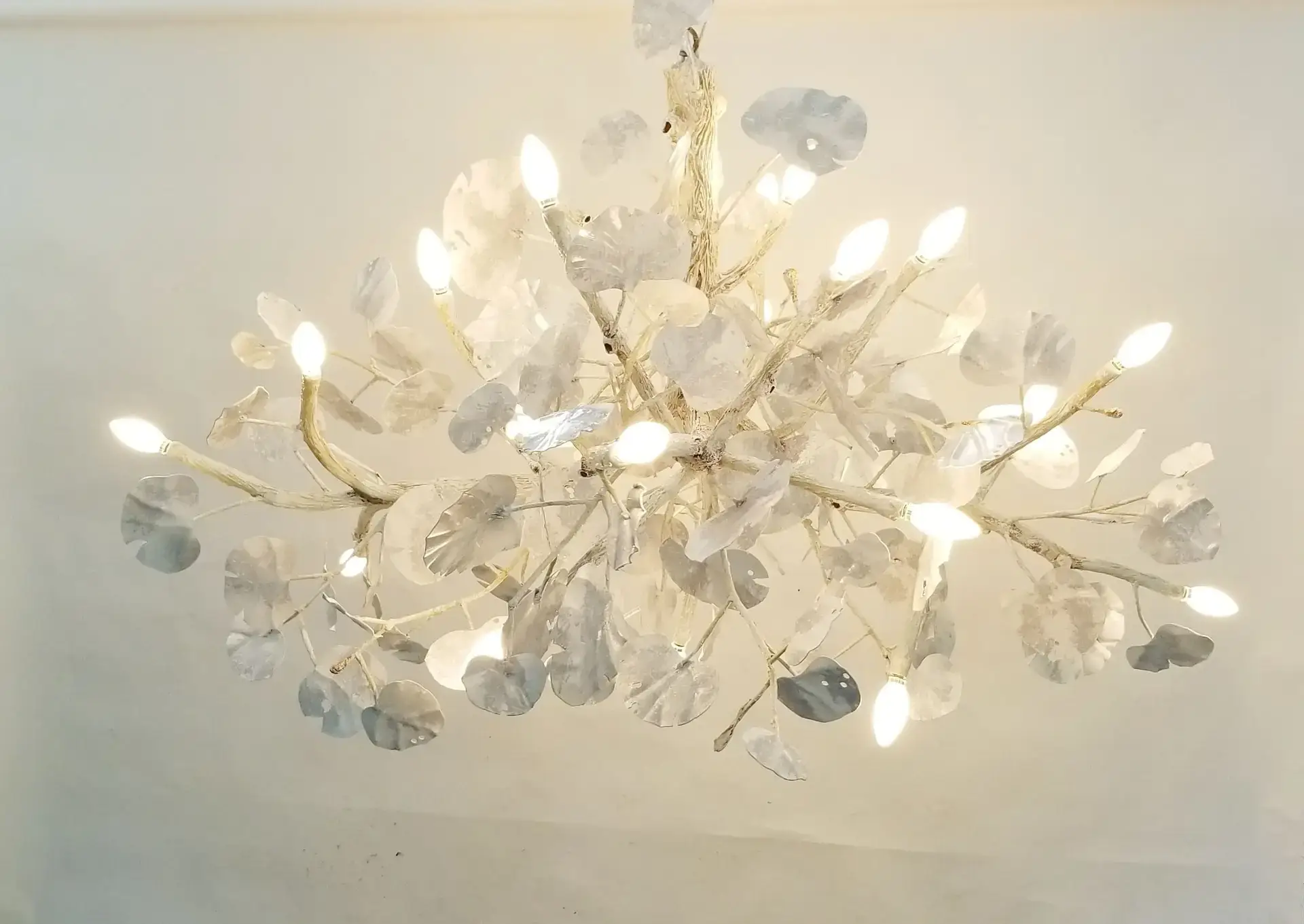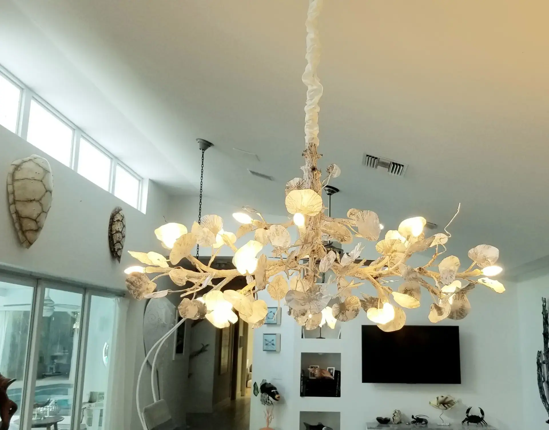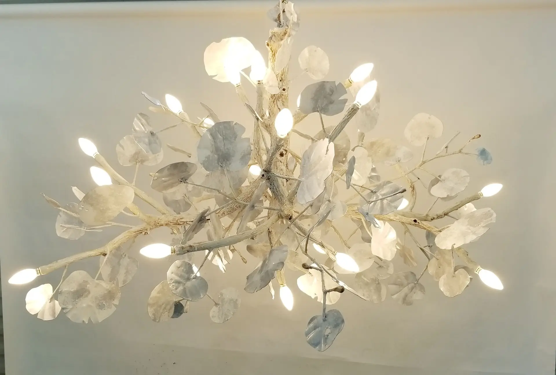 Ceiling lights are hand-made of steel and epoxies and come crated with LED bulbs. Everything is individually sized to the customer’s request. Ceiling lights, coral chandeliers, branch ceiling lights, sea kelp chandeliers, ribbon lights, cocoon monofilament lights, all colors available. All have LED dimmable lighting. Some styles include branch lighting, organic lighting, and tree lighting.