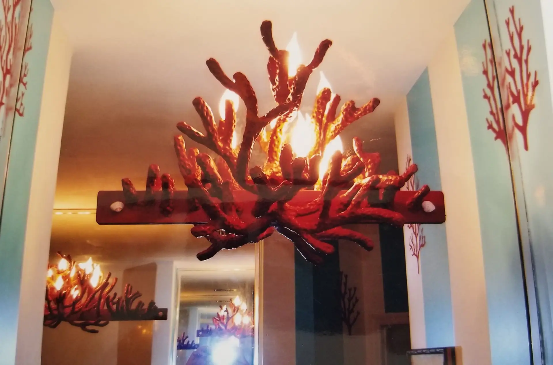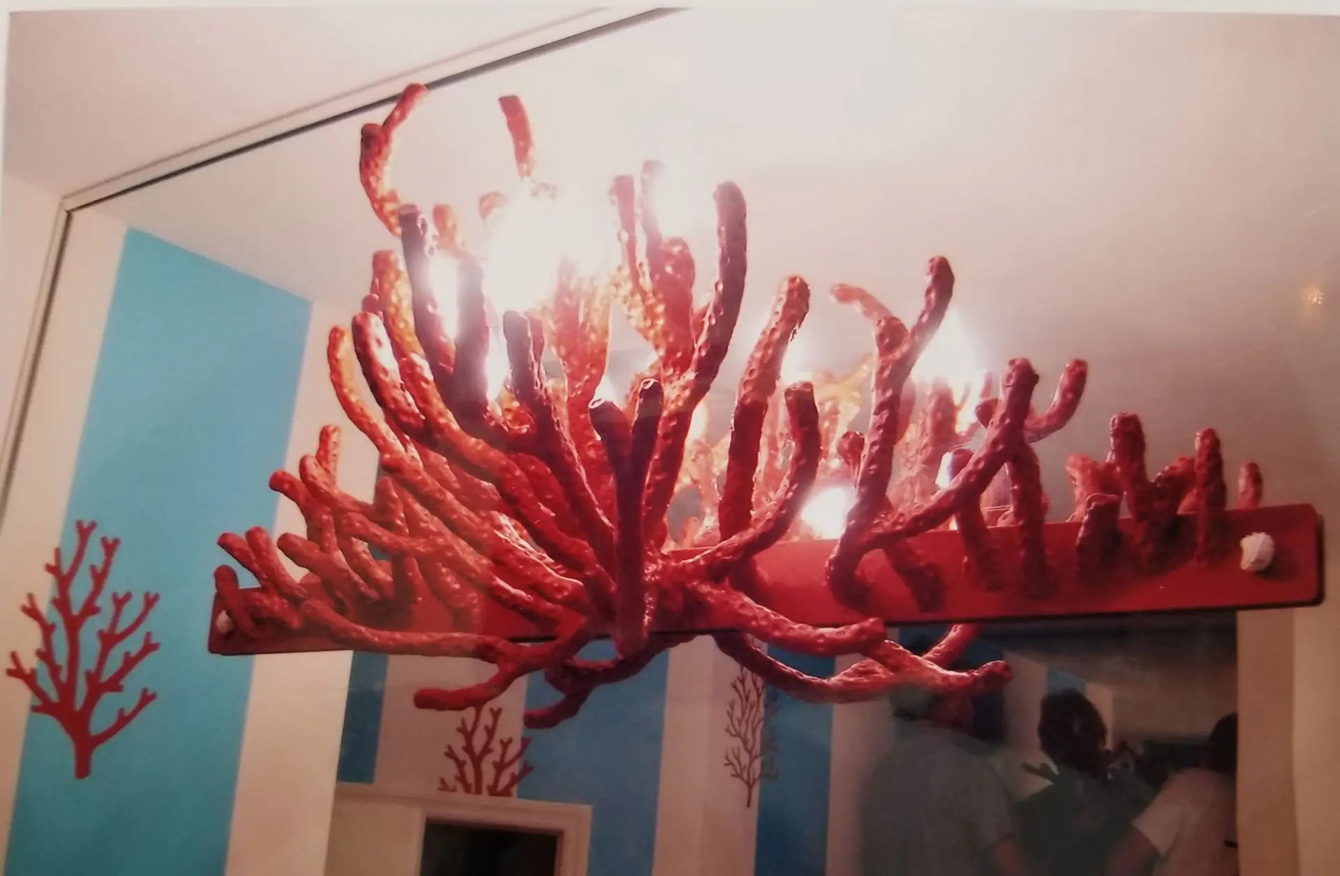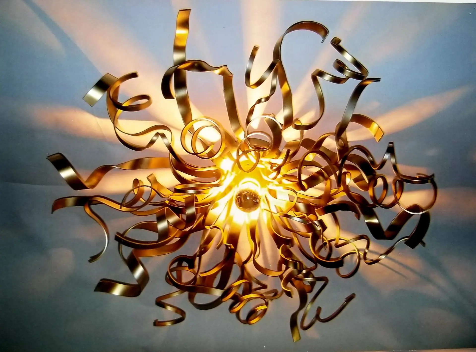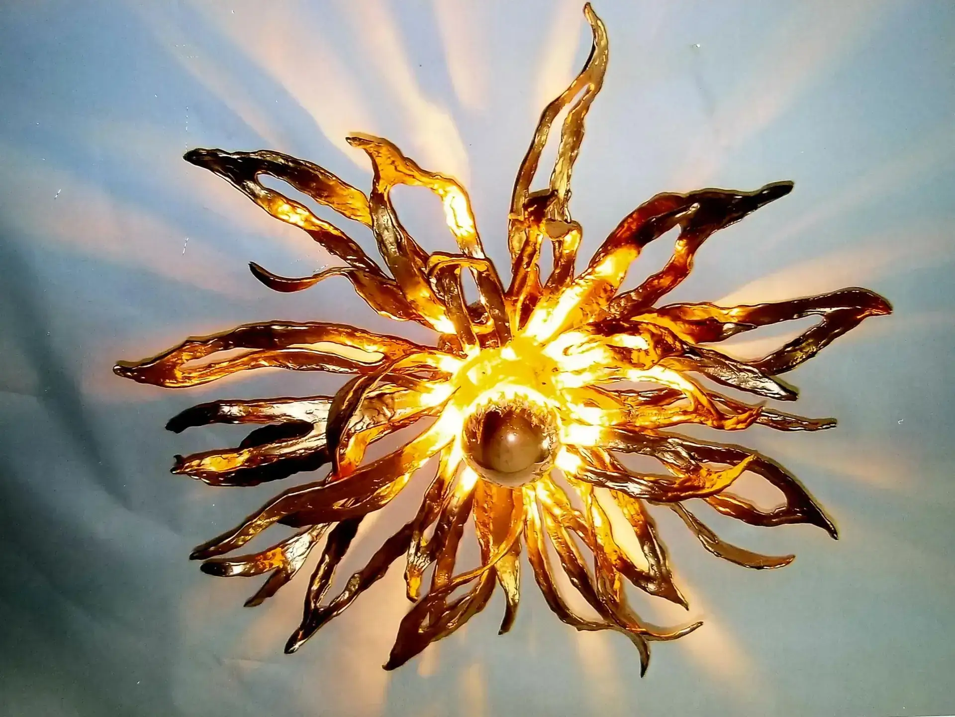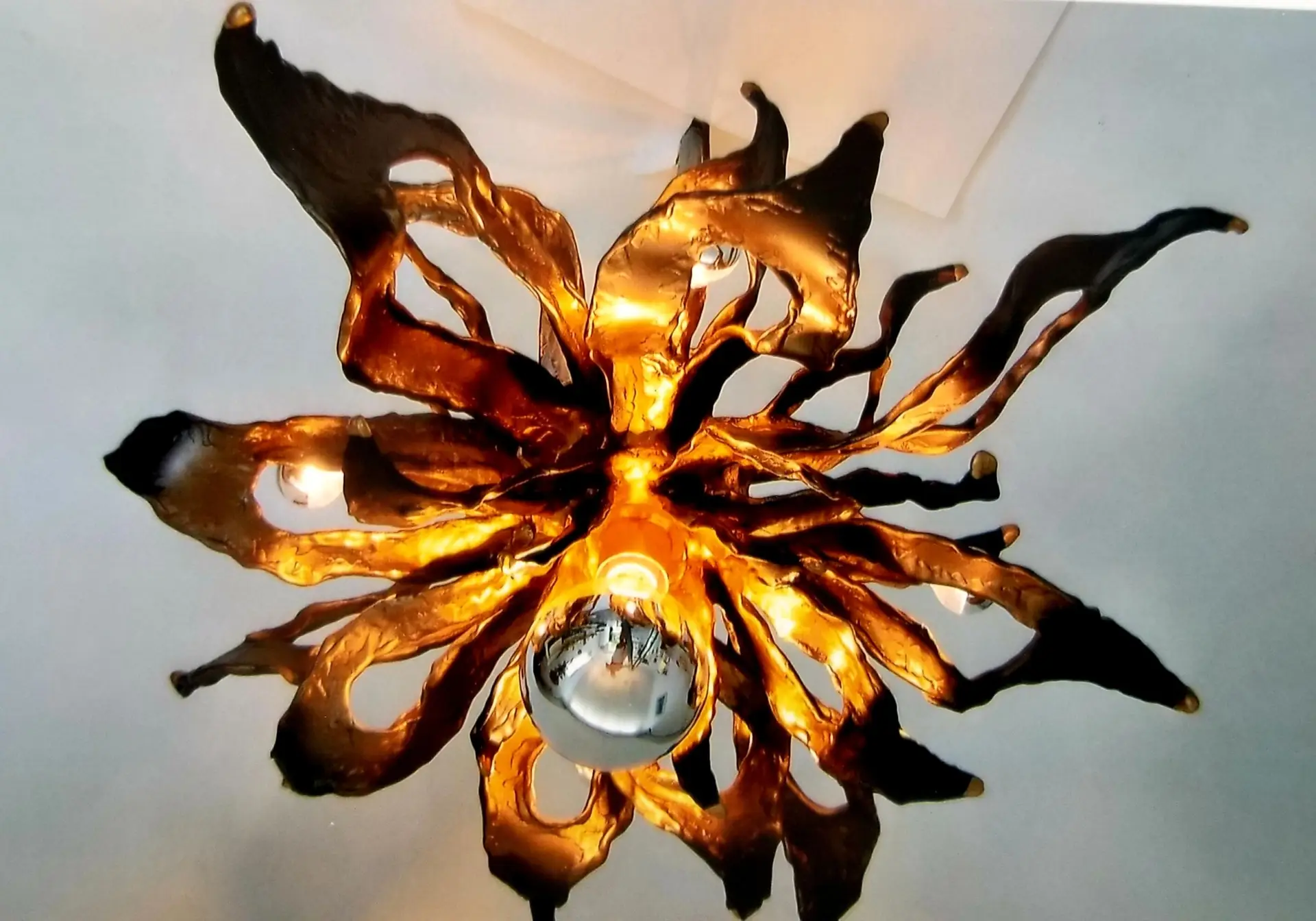 Ceiling lights are hand-made of steel and epoxies and come crated with LED bulbs. Everything is individually sized to the customer’s request. Ceiling lights, coral chandeliers, branch ceiling lights, sea kelp chandeliers, ribbon lights, cocoon monofilament lights, all colors available. All have LED dimmable lighting. Some styles include branch lighting, organic lighting, and tree lighting.