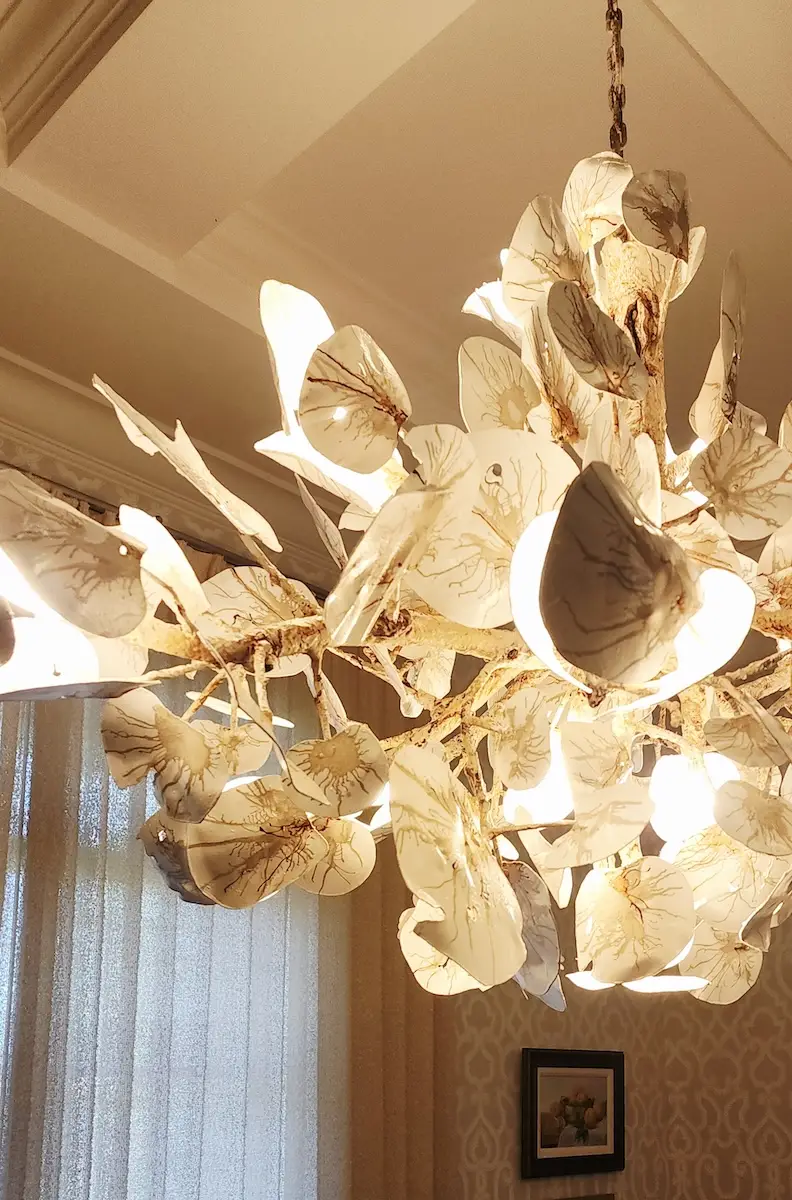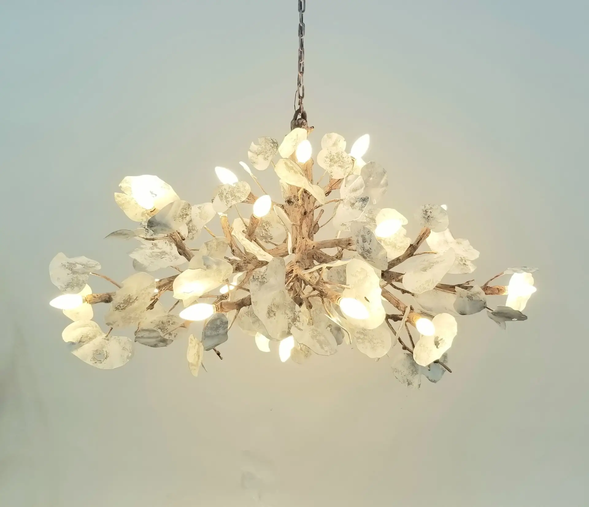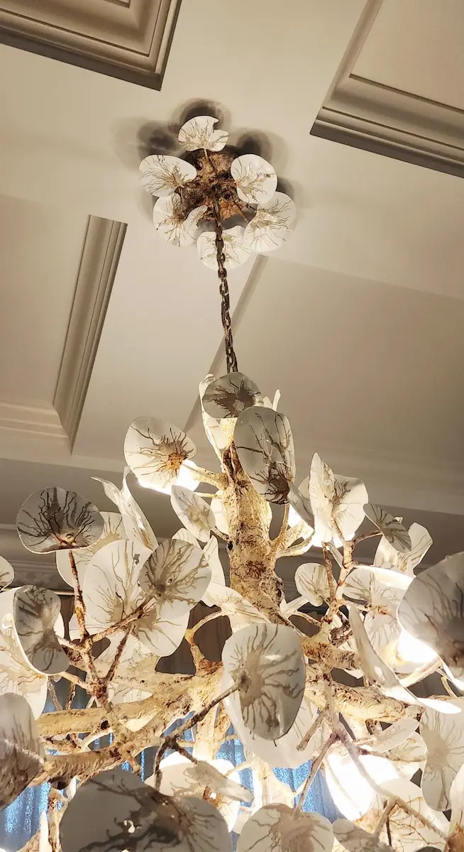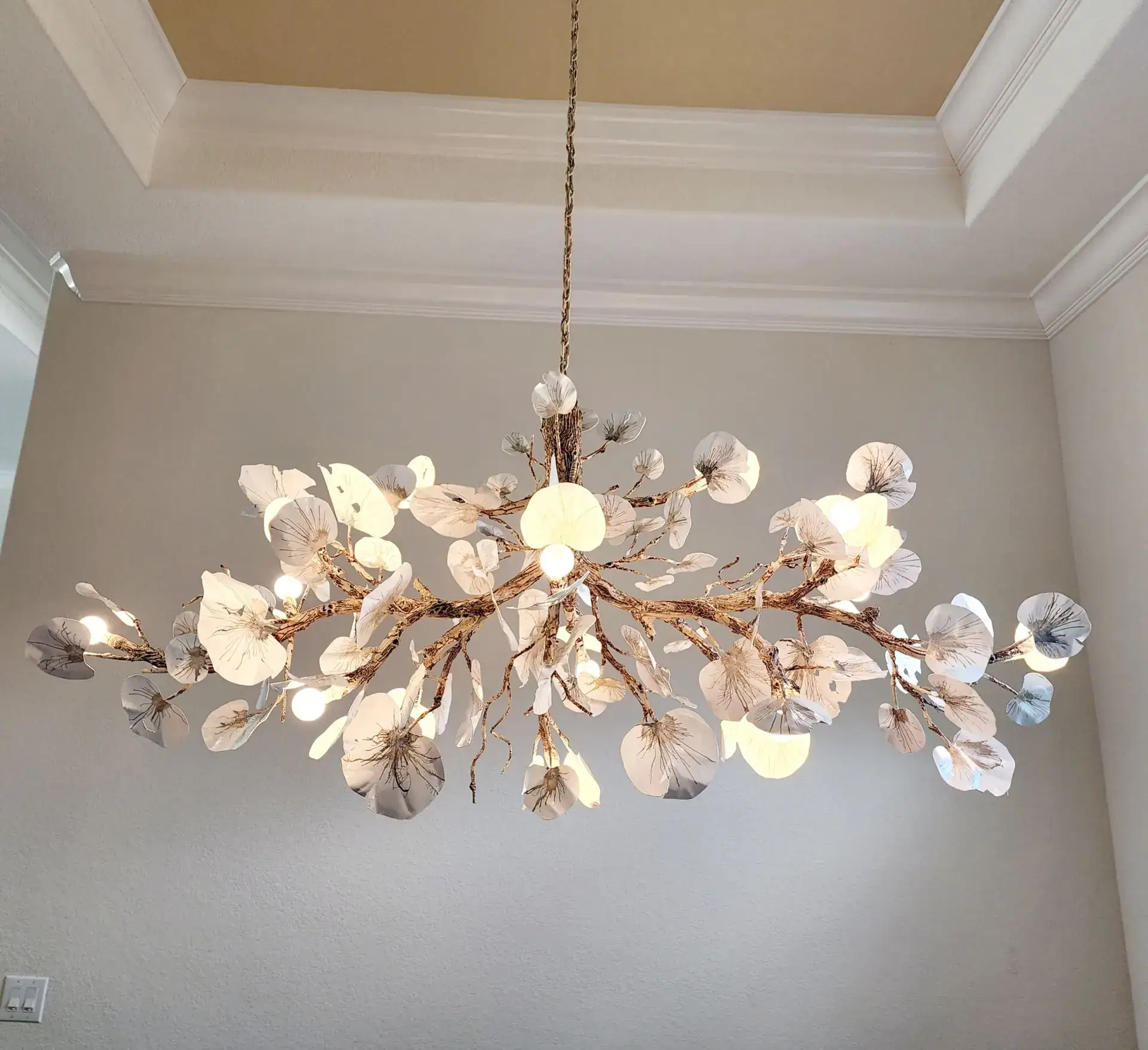 Ceiling lights are hand-made of steel and epoxies and come crated with LED bulbs. Everything is individually sized to the customer’s request. Ceiling lights, coral chandeliers, branch ceiling lights, sea kelp chandeliers, ribbon lights, cocoon monofilament lights, all colors available. All have LED dimmable lighting. Some styles include branch lighting, organic lighting, and tree lighting.