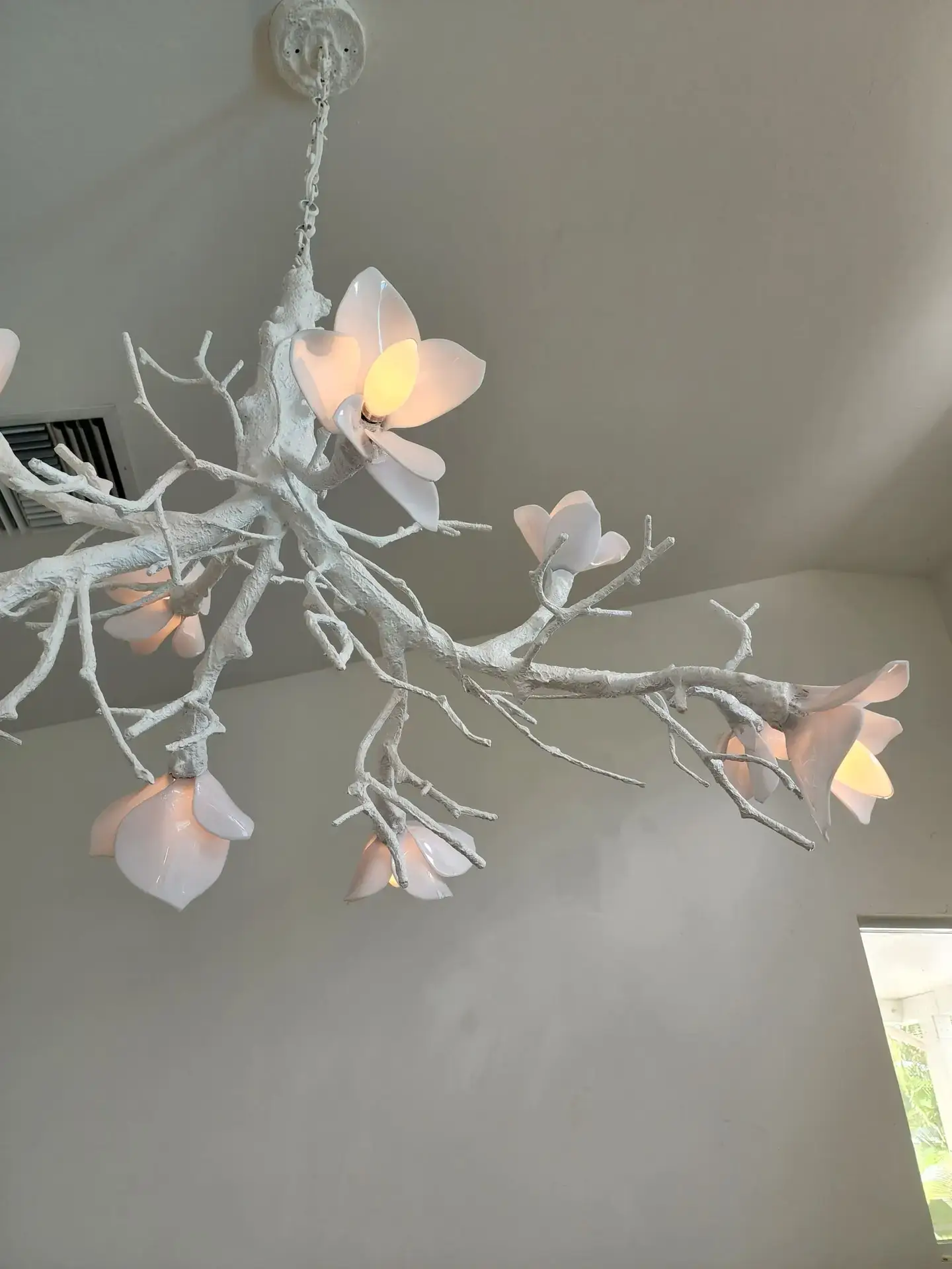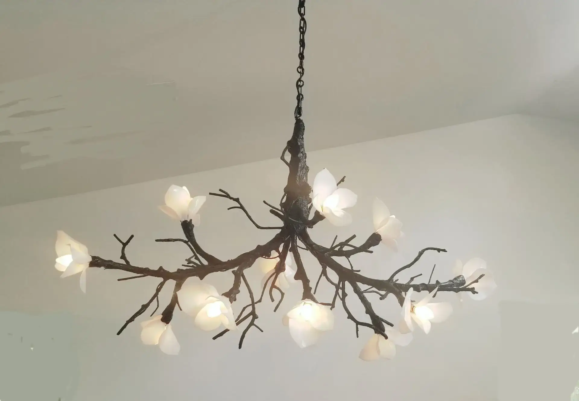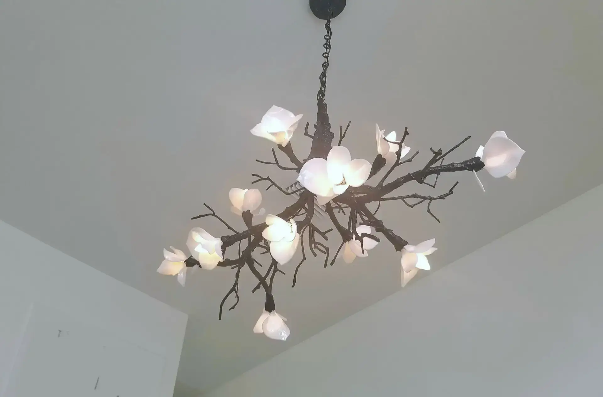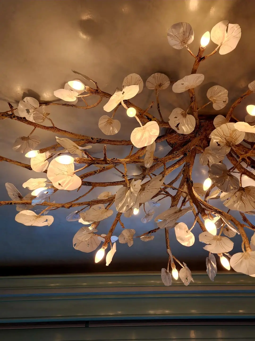 Ceiling lights are hand-made of steel and epoxies and come crated with LED bulbs. Everything is individually sized to the customer’s request. Ceiling lights, coral chandeliers, branch ceiling lights, sea kelp chandeliers, ribbon lights, cocoon monofilament lights, all colors available. All have LED dimmable lighting. Some styles include branch lighting, organic lighting, and tree lighting.