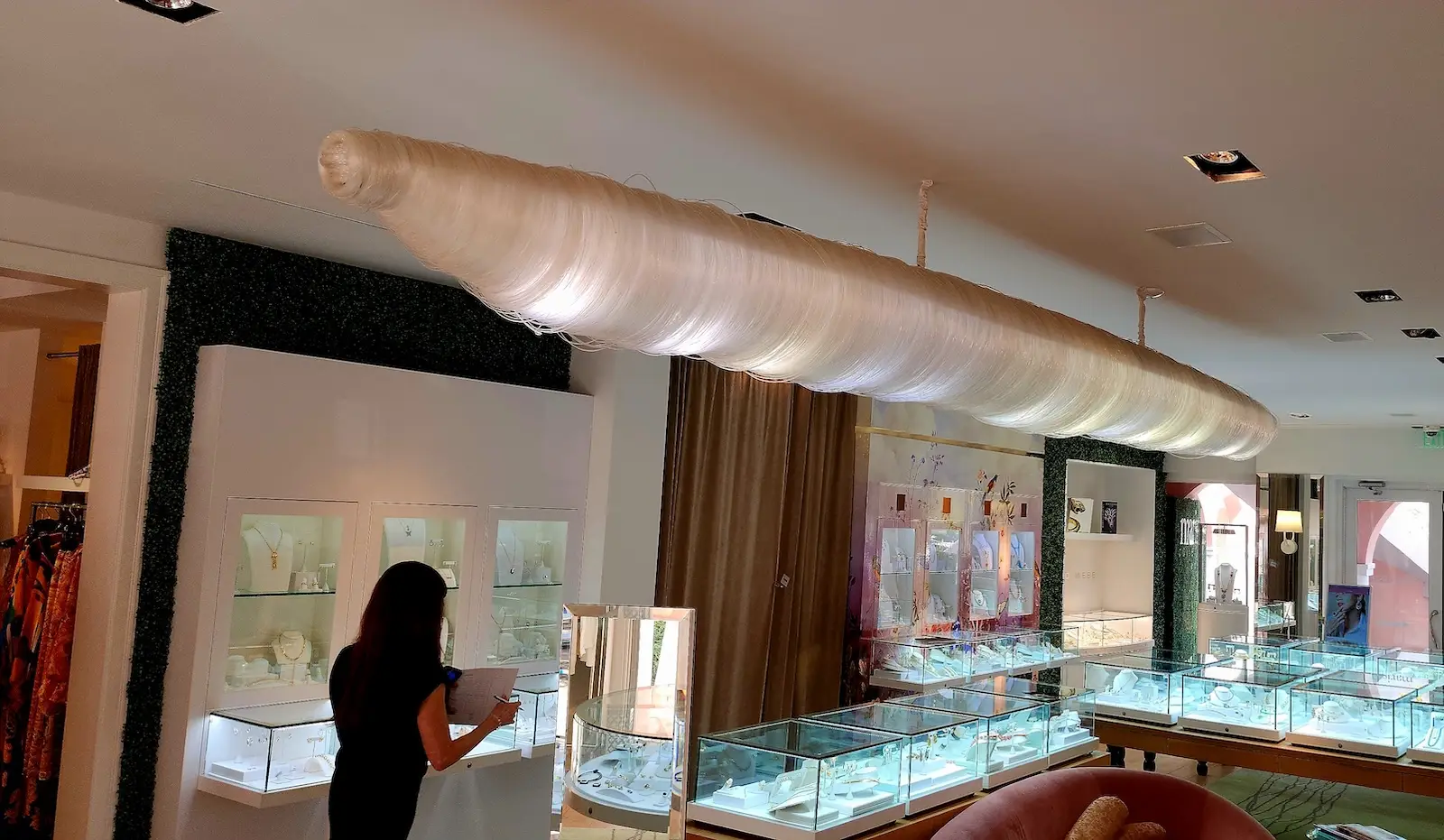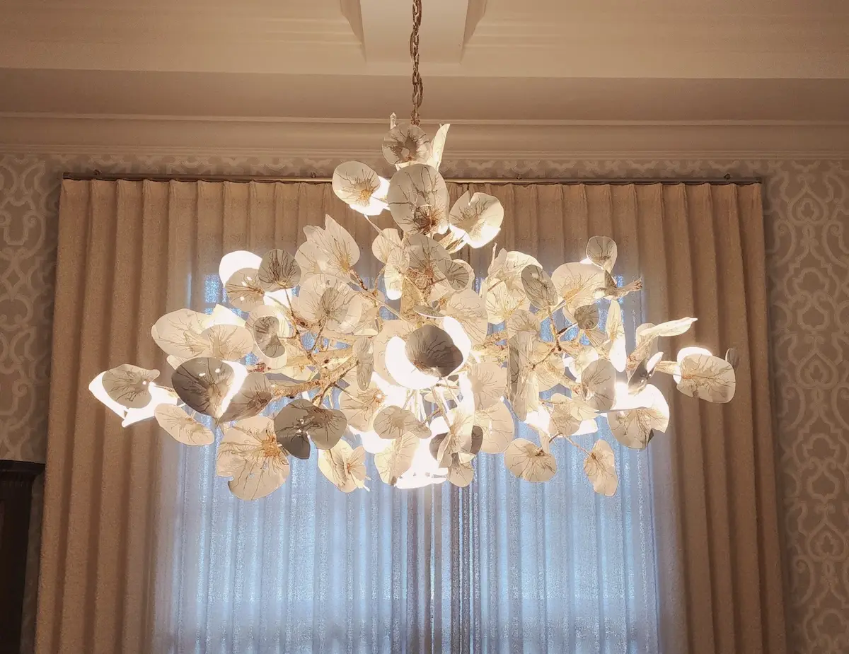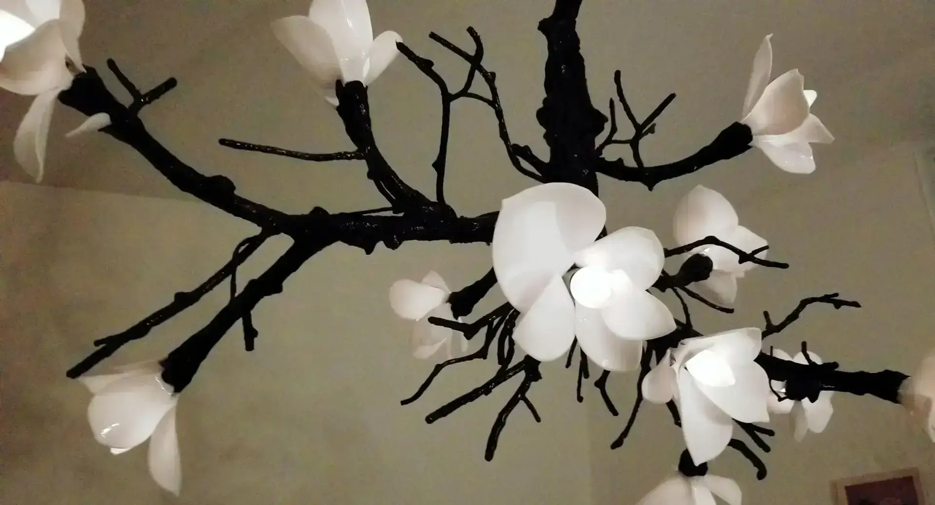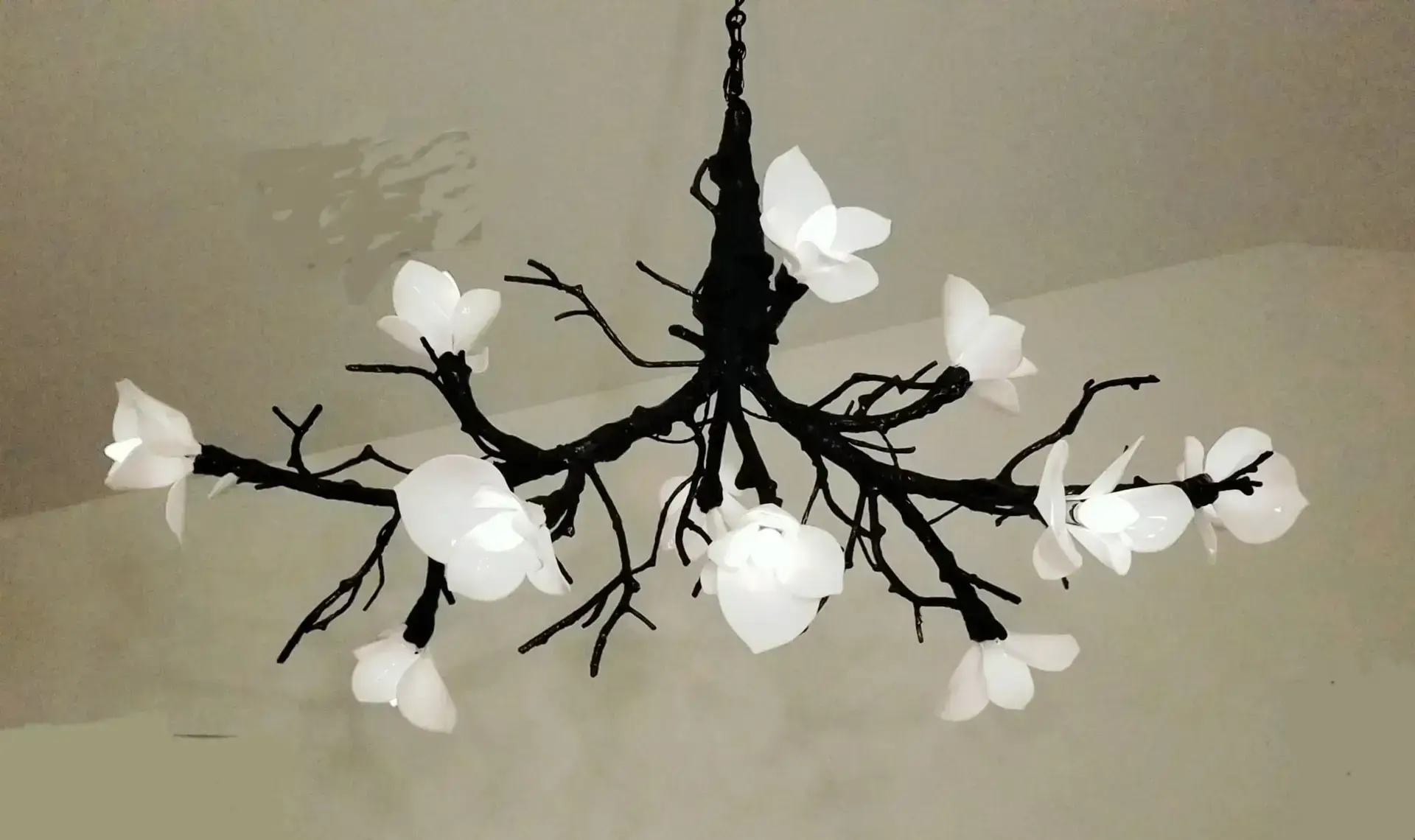 Ceiling lights are hand-made of steel and epoxies and come crated with LED bulbs. Everything is individually sized to the customer’s request. Ceiling lights, coral chandeliers, branch ceiling lights, sea kelp chandeliers, ribbon lights, cocoon monofilament lights, all colors available. All have LED dimmable lighting. Some styles include branch lighting, organic lighting, and tree lighting.